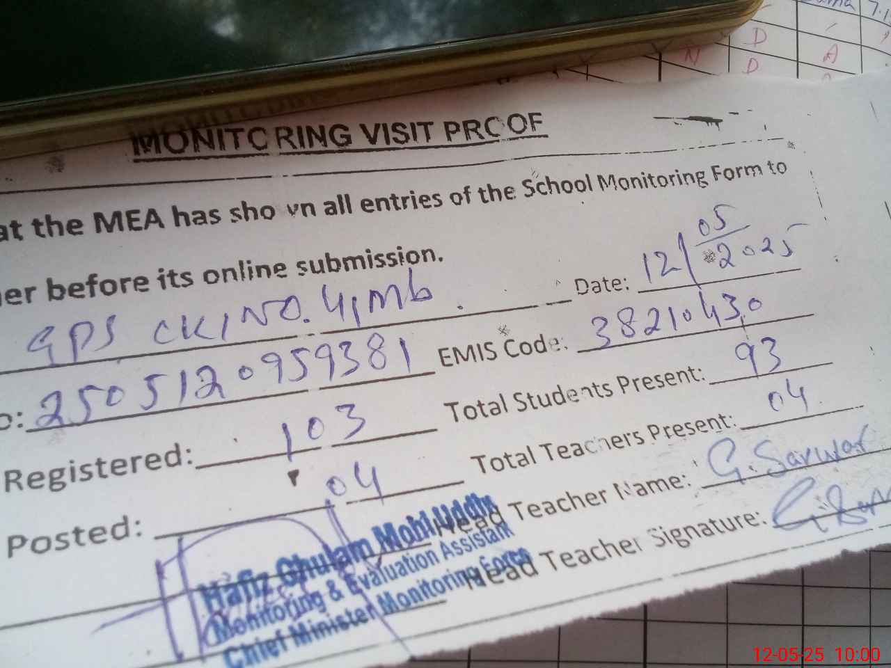 | Attendance Register | Head Teacher | MEA with School | Visit Proof |