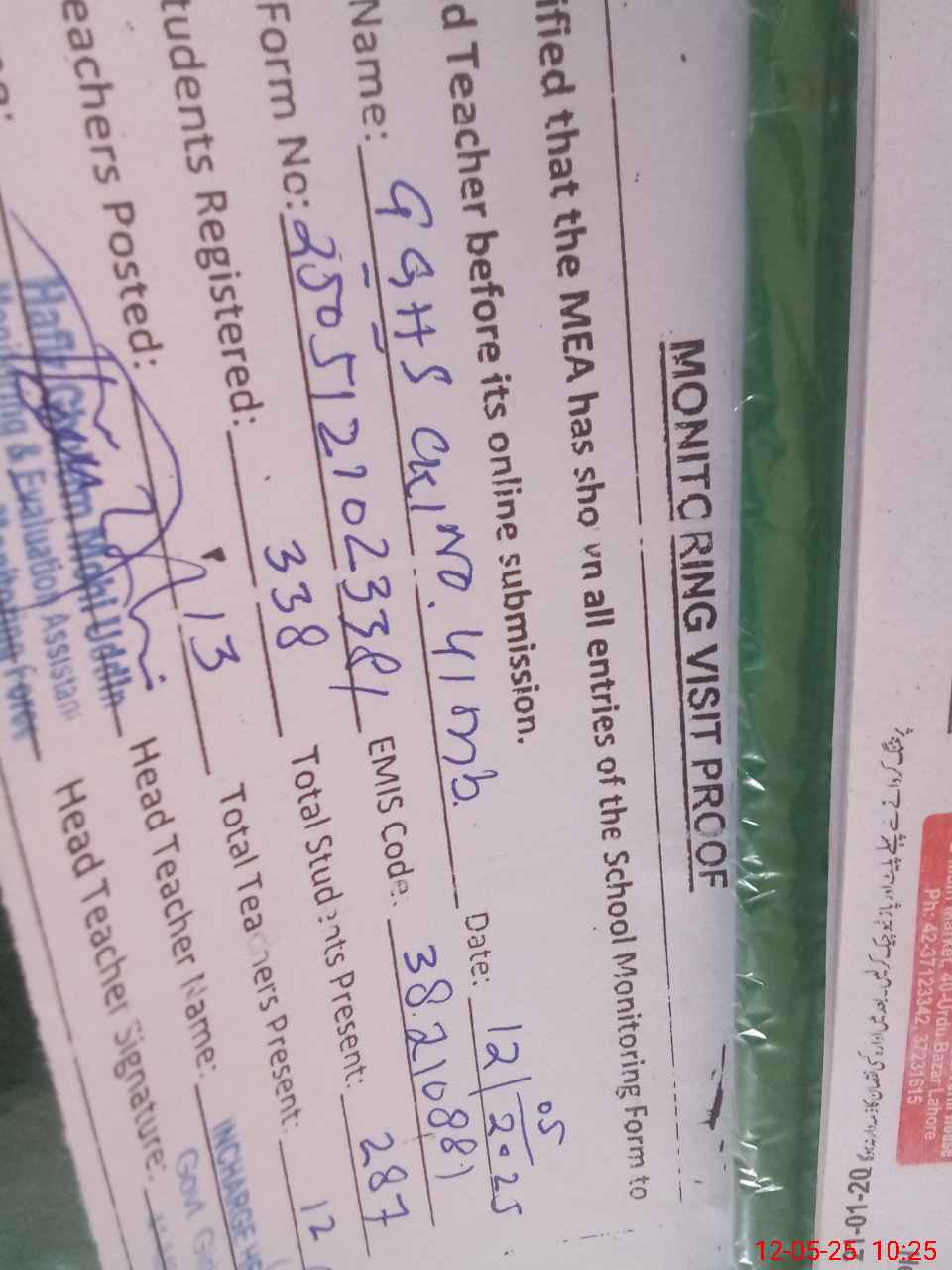 | Name: Az**** Ak**** Designation: (School Headmaster's/Headmistress's) H/ Mis Phone/Cell Number: 03**** |