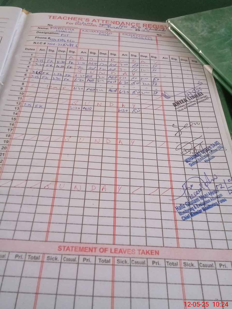 | CNIC | Full Name | Designation | R/C | Absence During Last Calender Month |