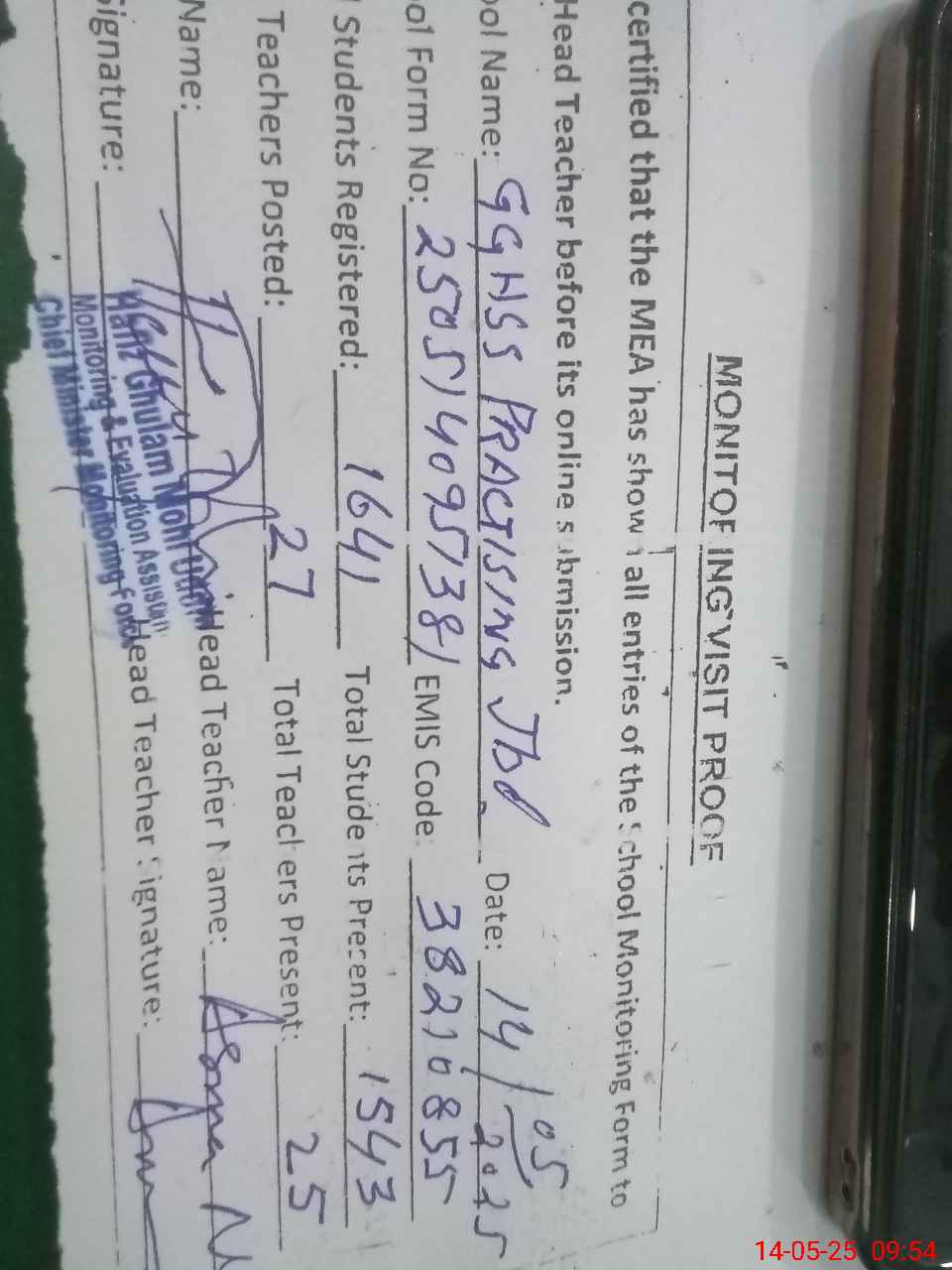 | Name: As**** Na**** Designation: (School Headmaster's/Headmistress's) principal Phone/Cell Number: 03**** |
