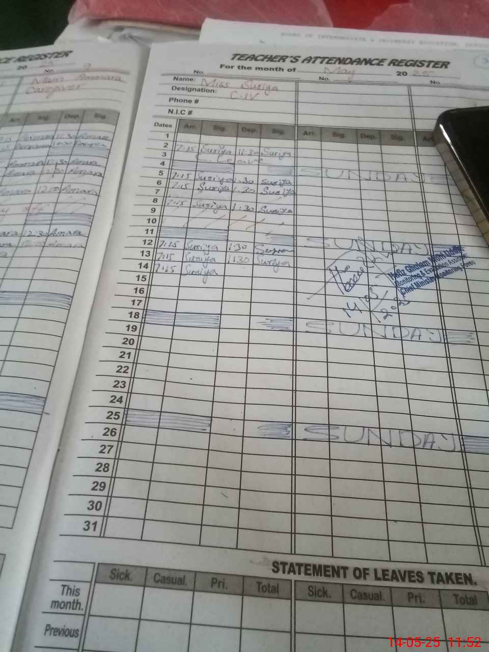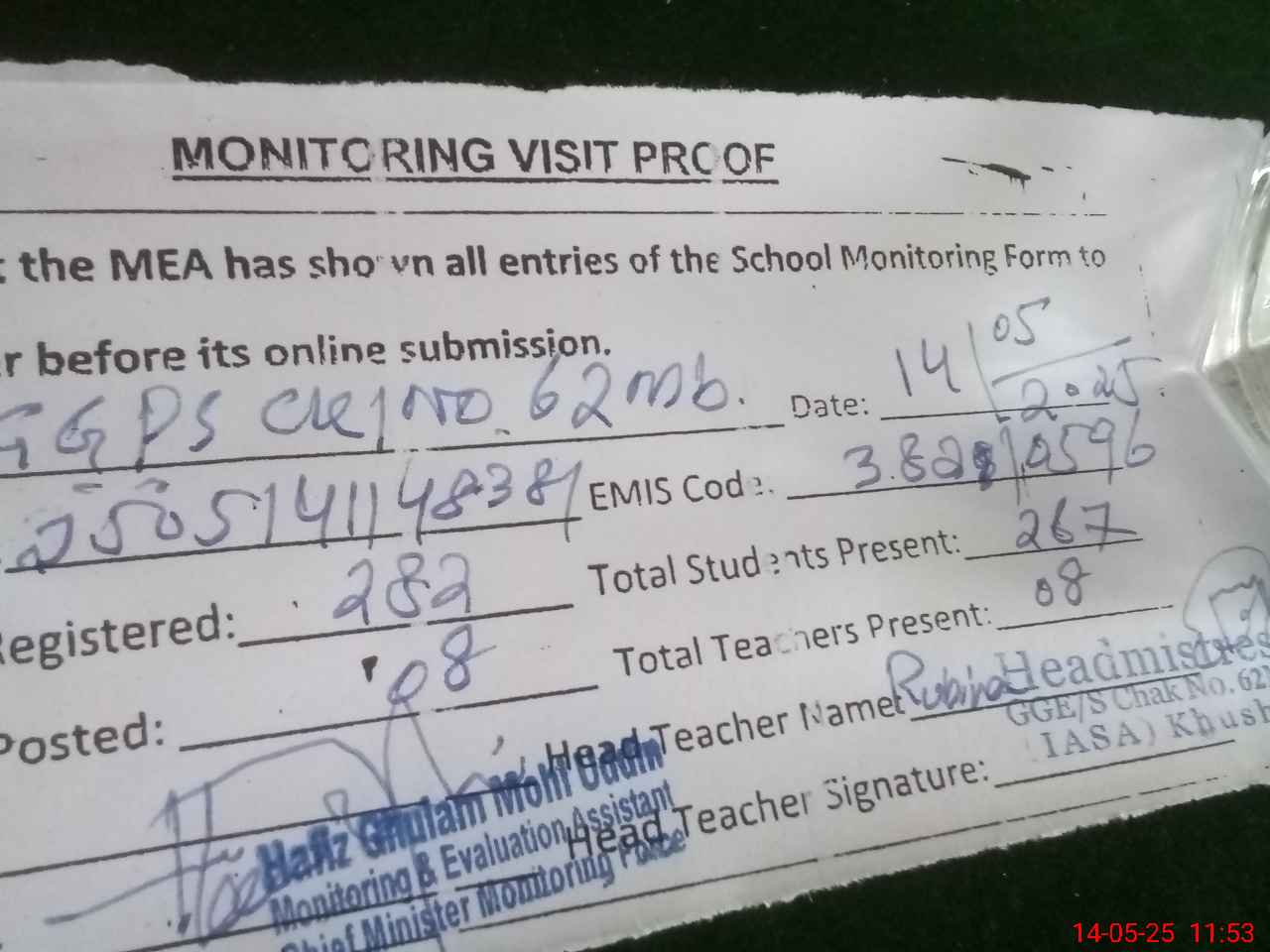 | Attendance Register | Head Teacher | MEA with School | Visit Proof |