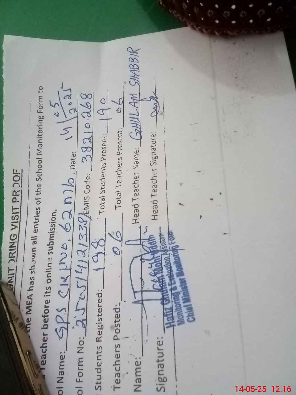 | Name: GH**** SH**** Designation: (School Headmaster's/Headmistress's) PST Phone/Cell Number: 03**** |