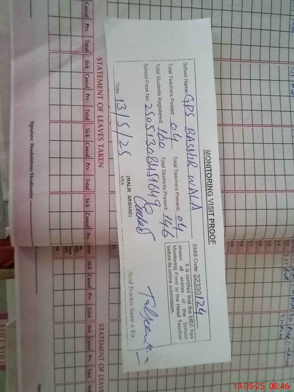 | Attendance Register | Head Teacher | MEA with School | Visit Proof |