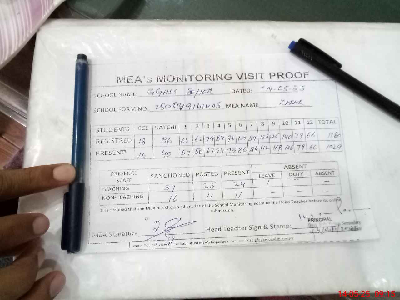 | Attendance Register | Head Teacher | MEA with School | Visit Proof |