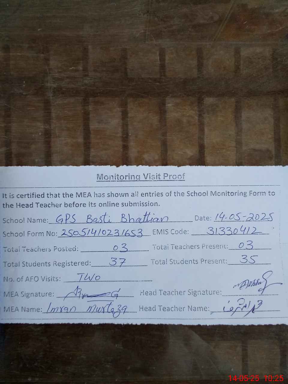 | Attendance Register | Head Teacher | MEA with School | Visit Proof |
