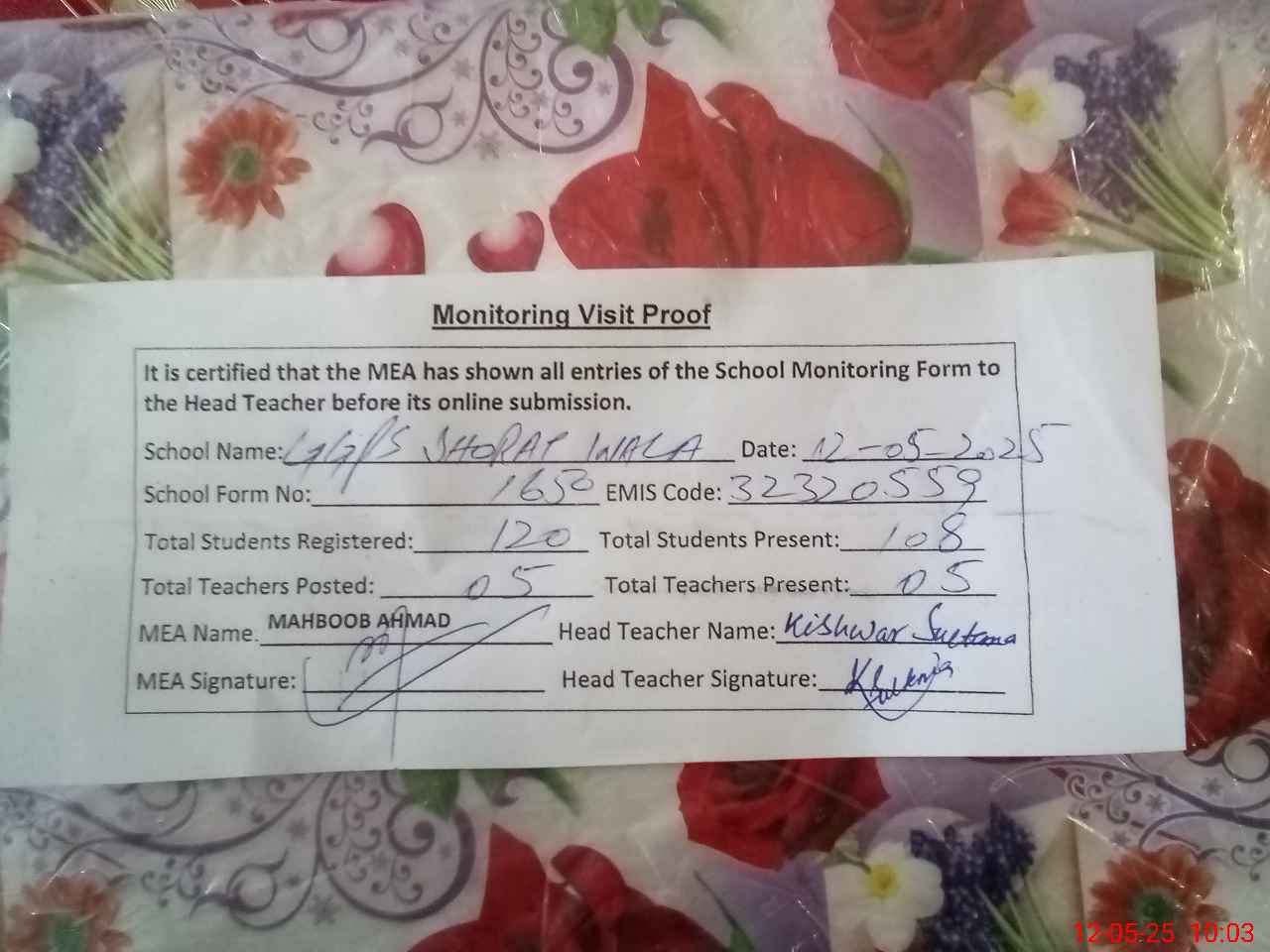 | EMIS Code: 32320559 | Name of School: GGPS SHOHRAT WALA | |||
