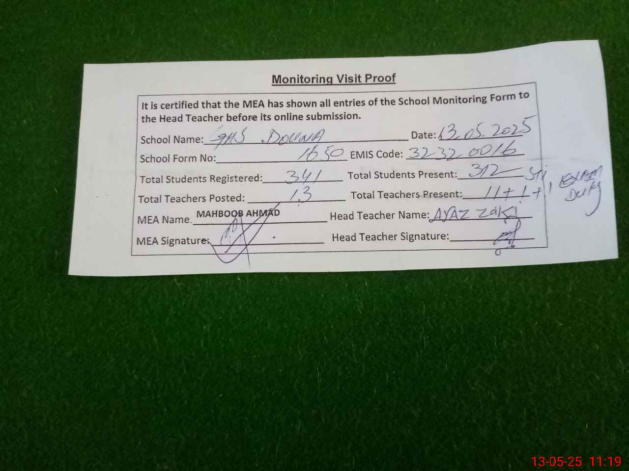 | Certified that this School was Inspected by the Undersigned MEA/DMO Today and the Information Stated Above is as Per Record. | |||||