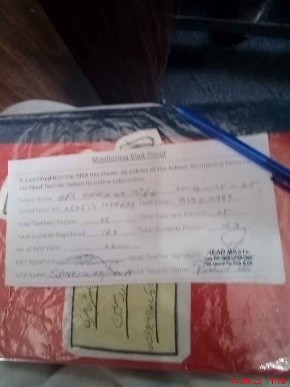 | Attendance Register | Head Teacher | MEA with School | Visit Proof |