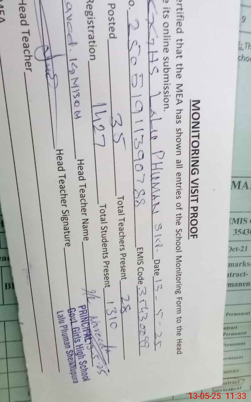 | Attendance Register | Head Teacher | MEA with School | Visit Proof |