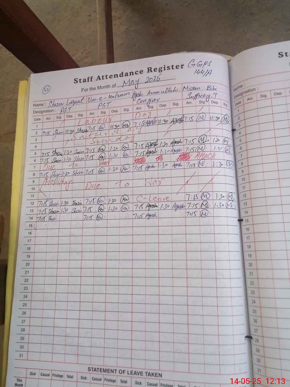 | Leave | Duty | Absent | Maternity | Medical | Ex- Pak |