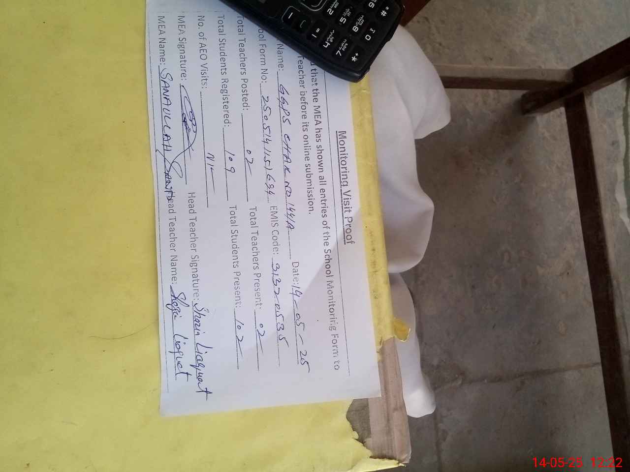 | Attendance Register | Head Teacher | MEA with School | Visit Proof |