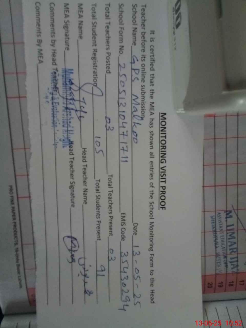 | Attendance Register | Head Teacher | MEA with School | Visit Proof |