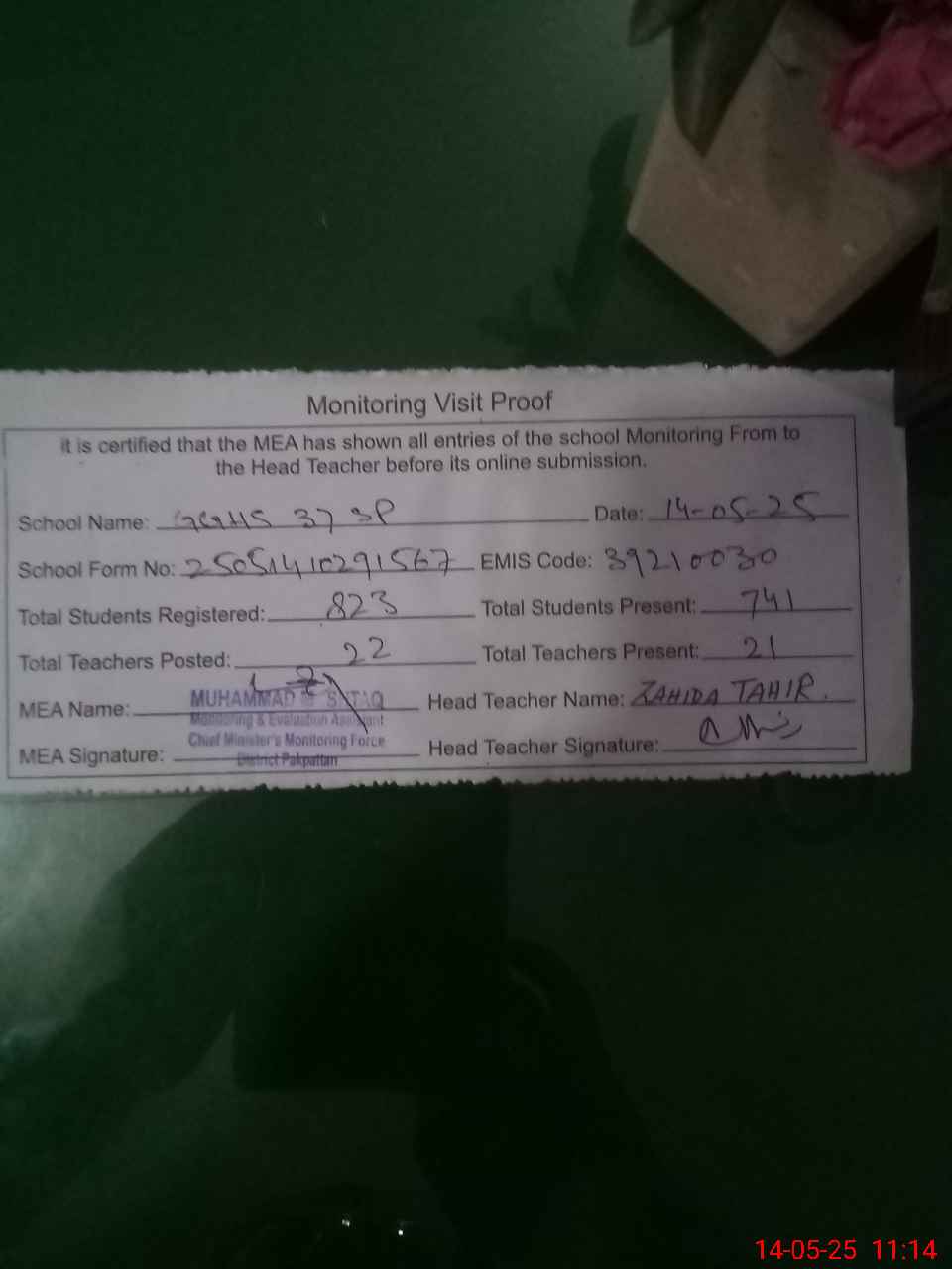 | EMIS Code: 39210030 | Name of School: GGHS 37 SP PAKPATTAN | |||
