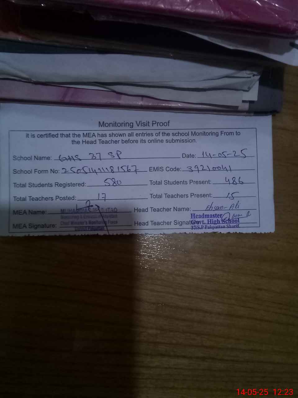 | Attendance Register | Head Teacher | MEA with School | Visit Proof |