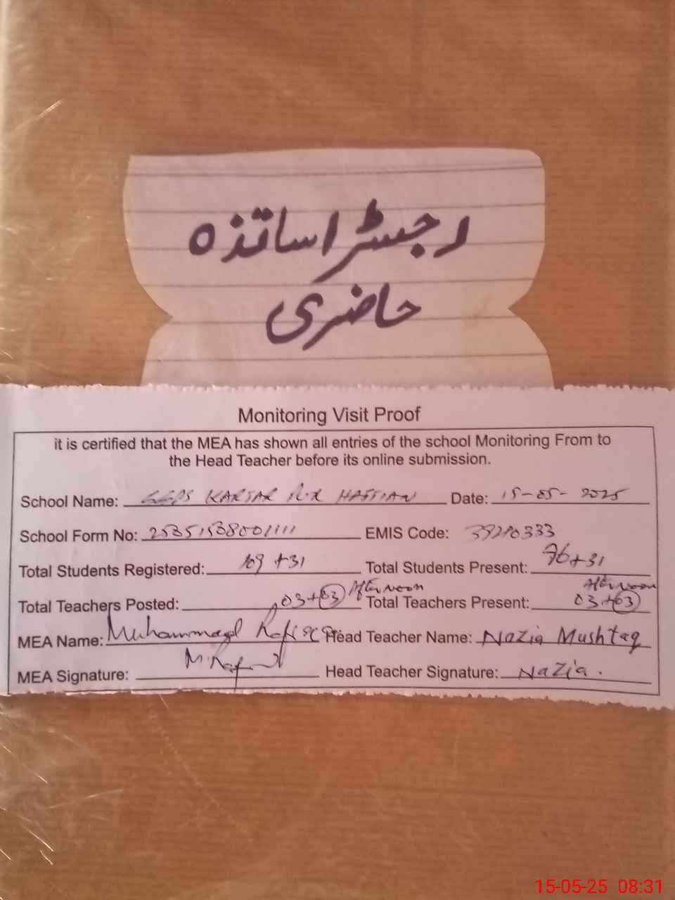 | Attendance Register | Head Teacher | MEA with School | Visit Proof |