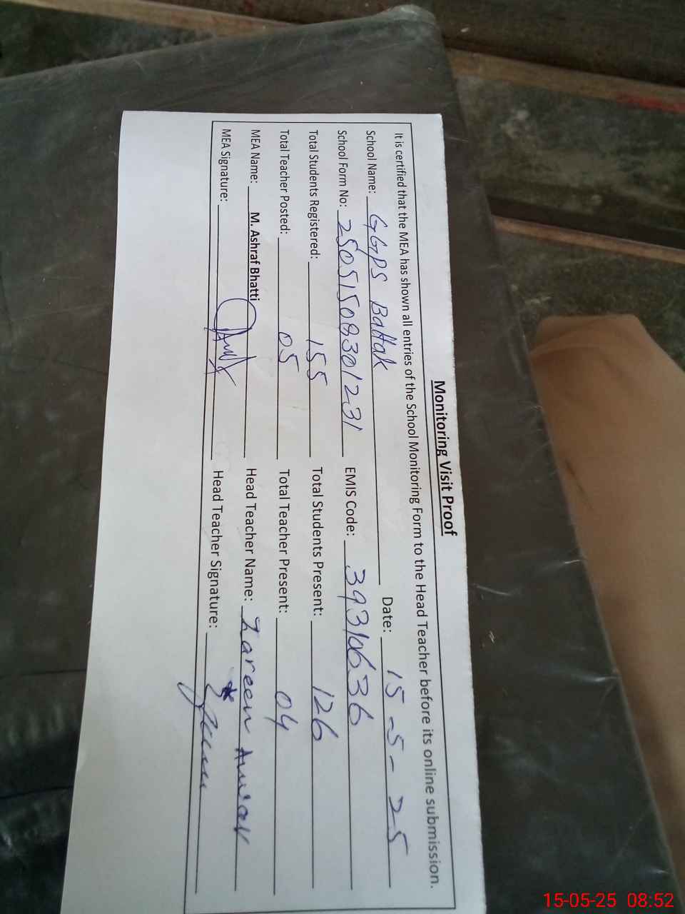 | Attendance Register | Head Teacher | MEA with School | Visit Proof |
