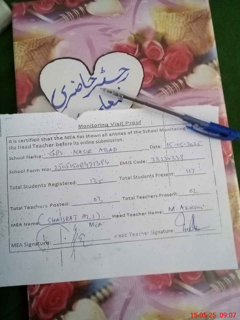 | Attendance Register | Head Teacher | MEA with School | Visit Proof |