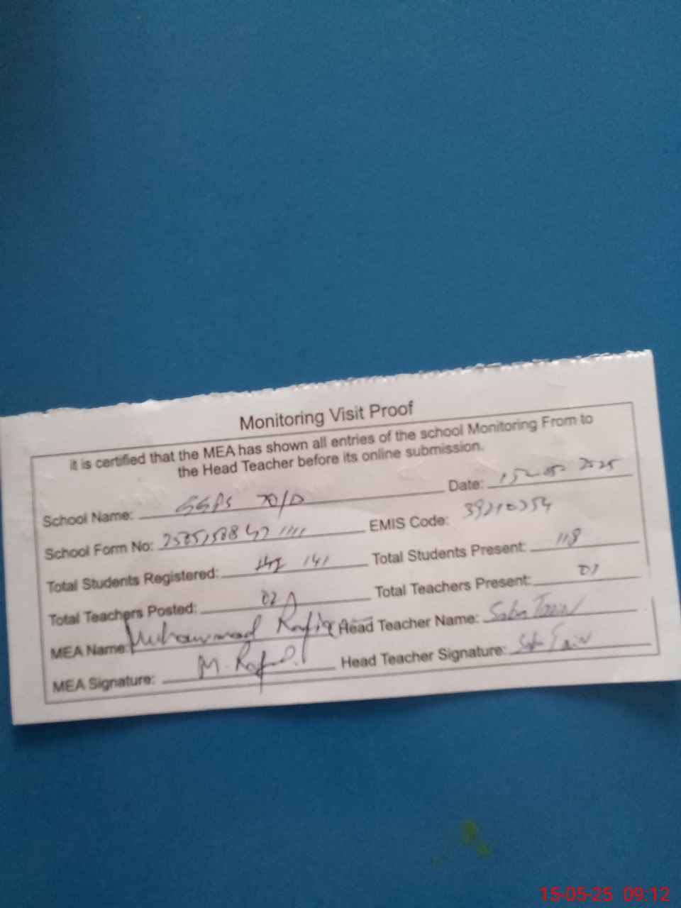 | Attendance Register | Head Teacher | MEA with School | Visit Proof |