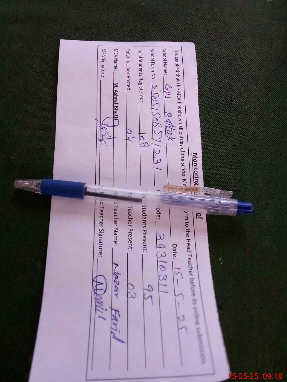 | Attendance Register | Head Teacher | MEA with School | Visit Proof |