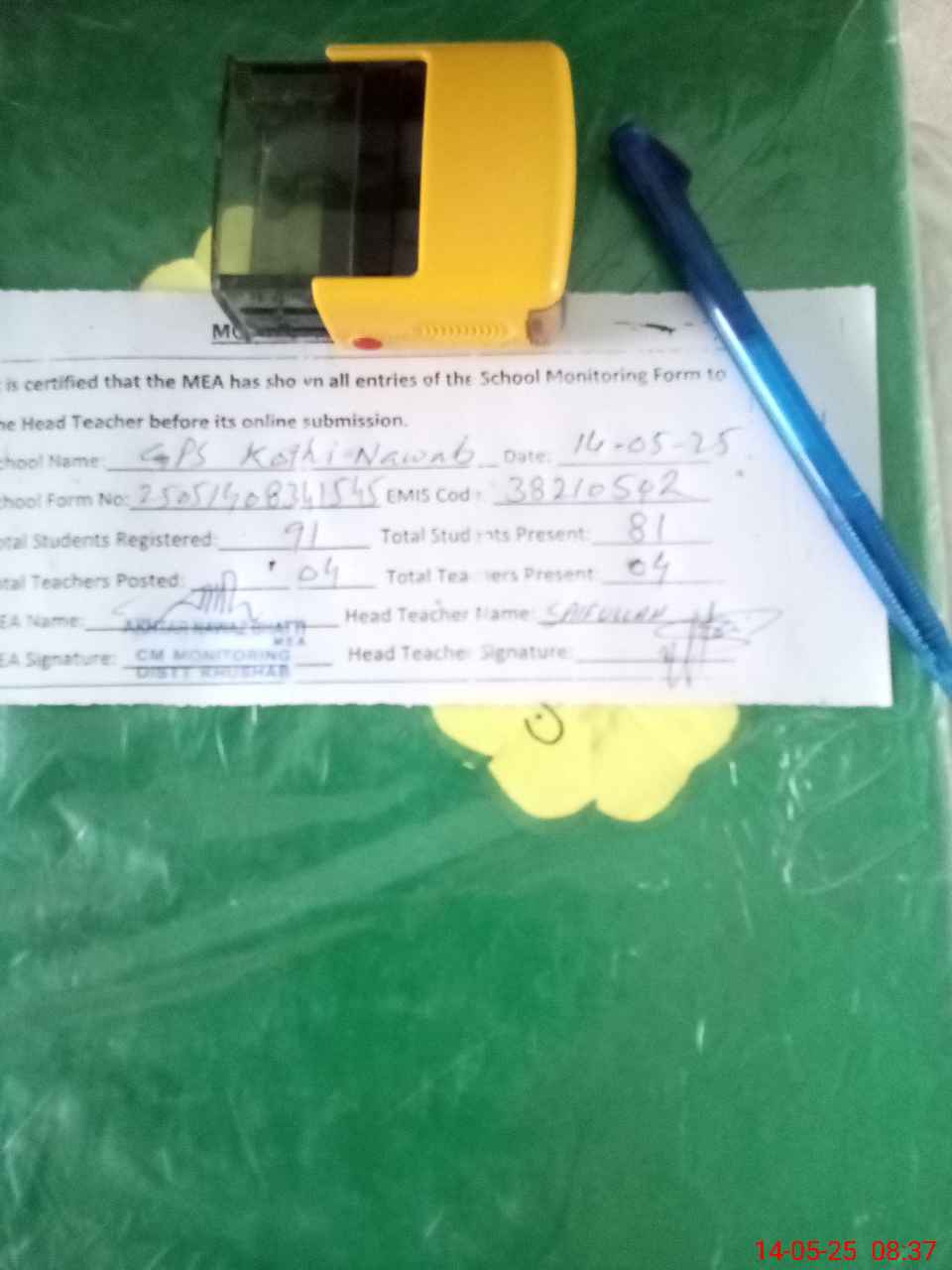 | Attendance Register | Head Teacher | MEA with School | Visit Proof |