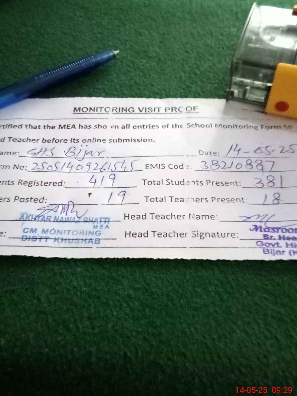 | EMIS Code: 38210887 | Name of School: GHS BIJAR | |||