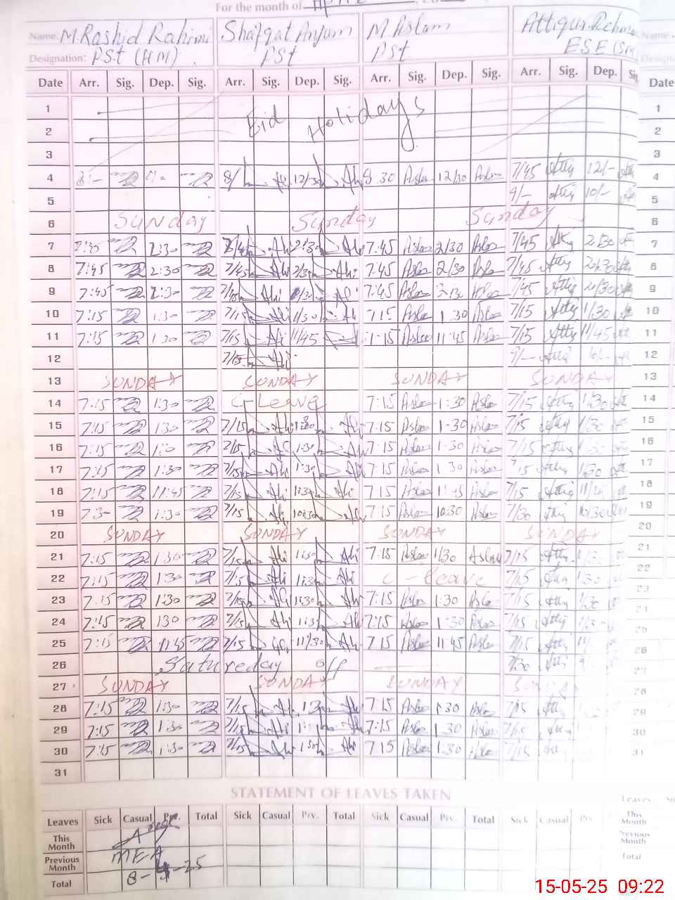 | CNIC | Full Name | Designation | R/C | Absence During Last Calender Month |