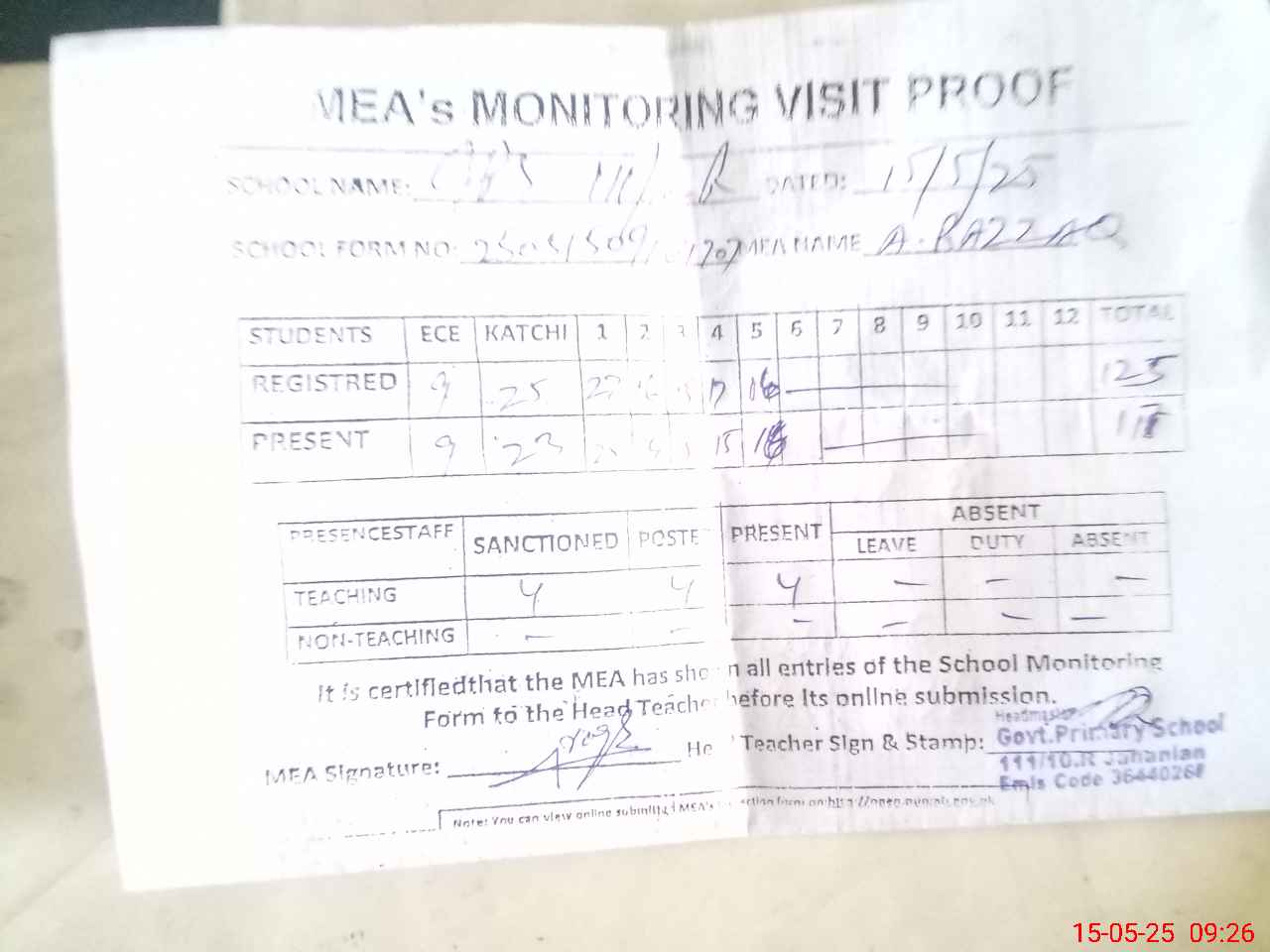 | Attendance Register | Head Teacher | MEA with School | Visit Proof |