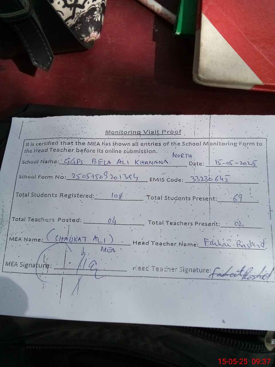 | Attendance Register | Head Teacher | MEA with School | Visit Proof |