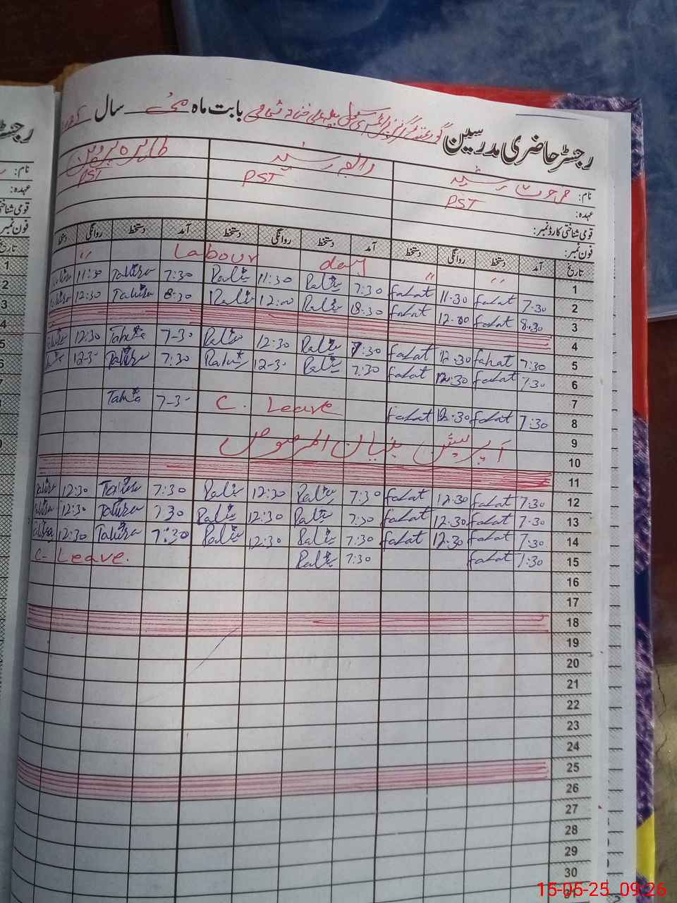 | CNIC | Full Name | Designation | R/C | Absence During Last Calender Month |