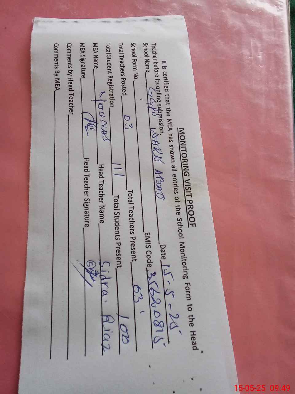 | Attendance Register | Head Teacher | MEA with School | Visit Proof |