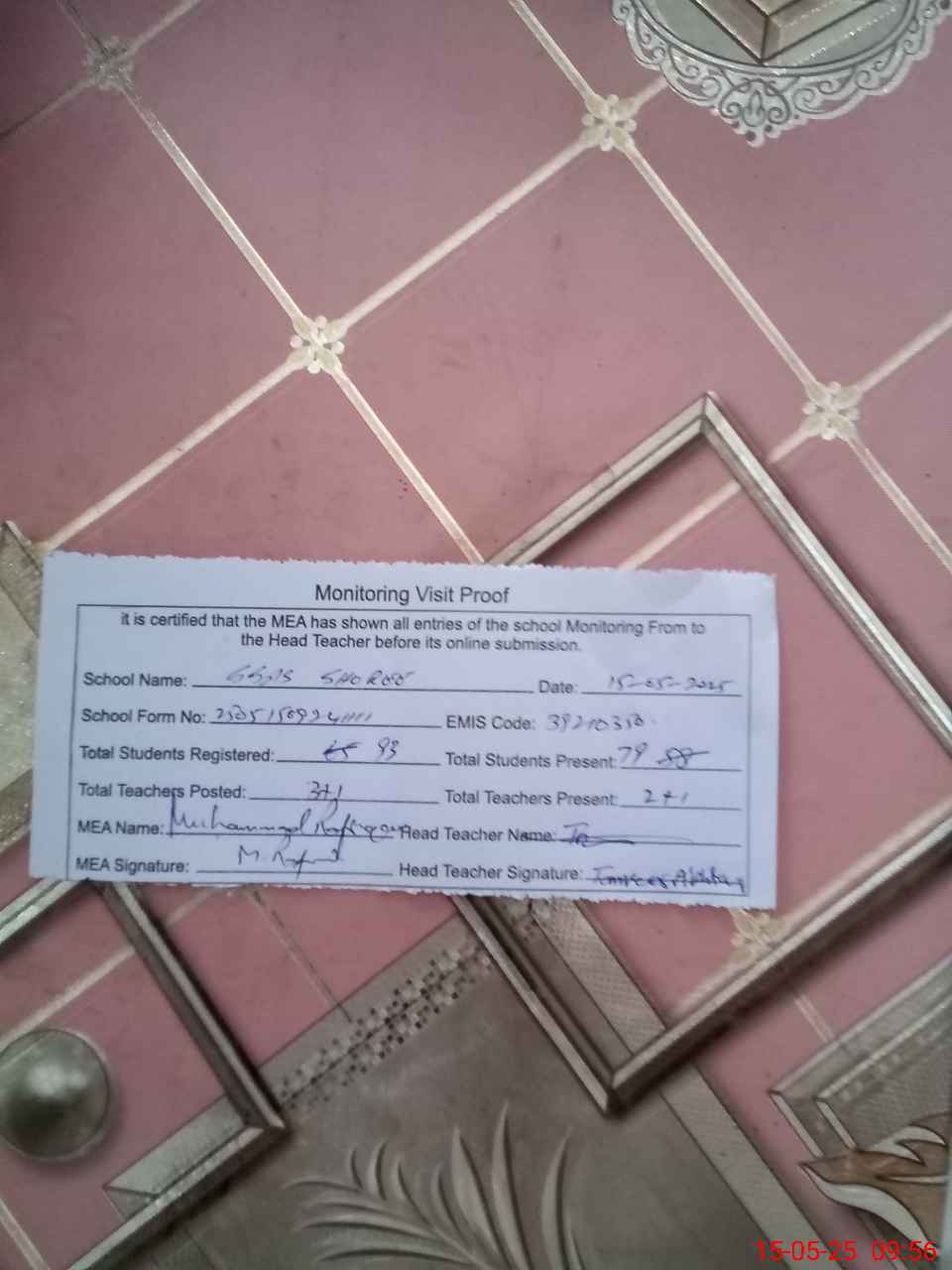 | Attendance Register | Head Teacher | MEA with School | Visit Proof |