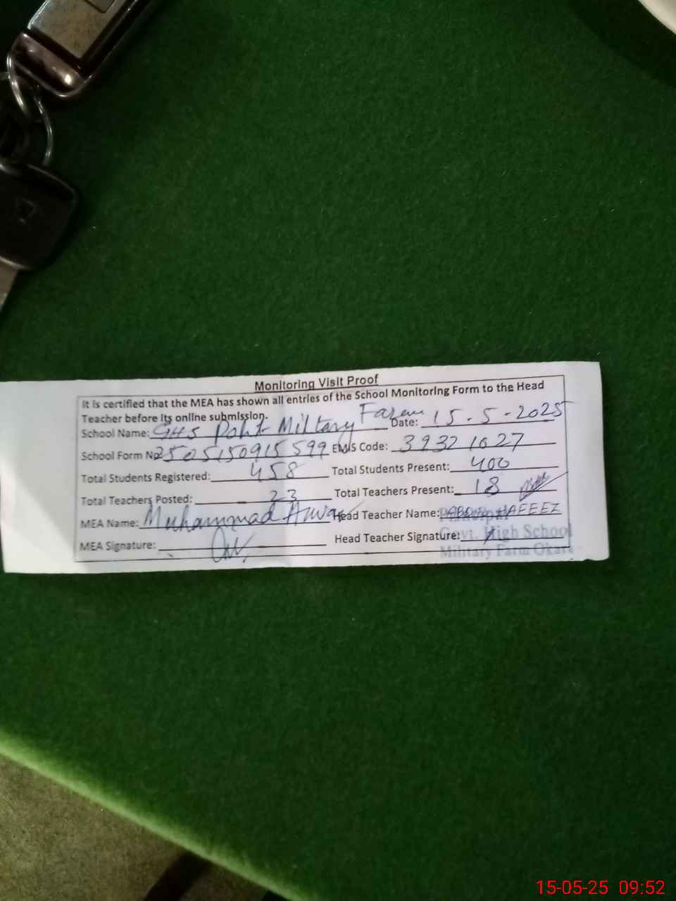 | Certified that this School was Inspected by the Undersigned MEA/DMO Today and the Information Stated Above is as Per Record. | |||||
