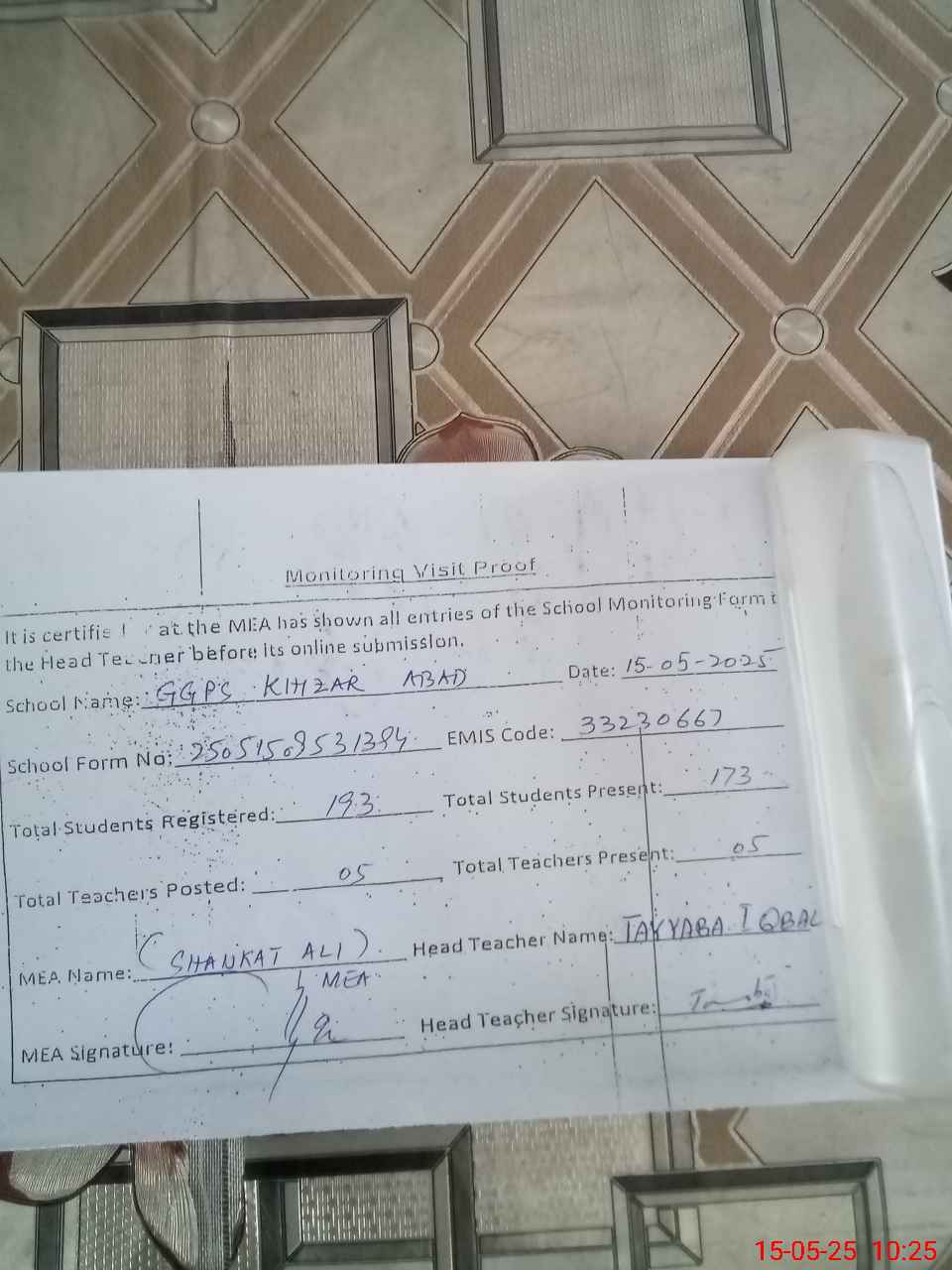 | Certified that this School was Inspected by the Undersigned MEA/DMO Today and the Information Stated Above is as Per Record. | |||||