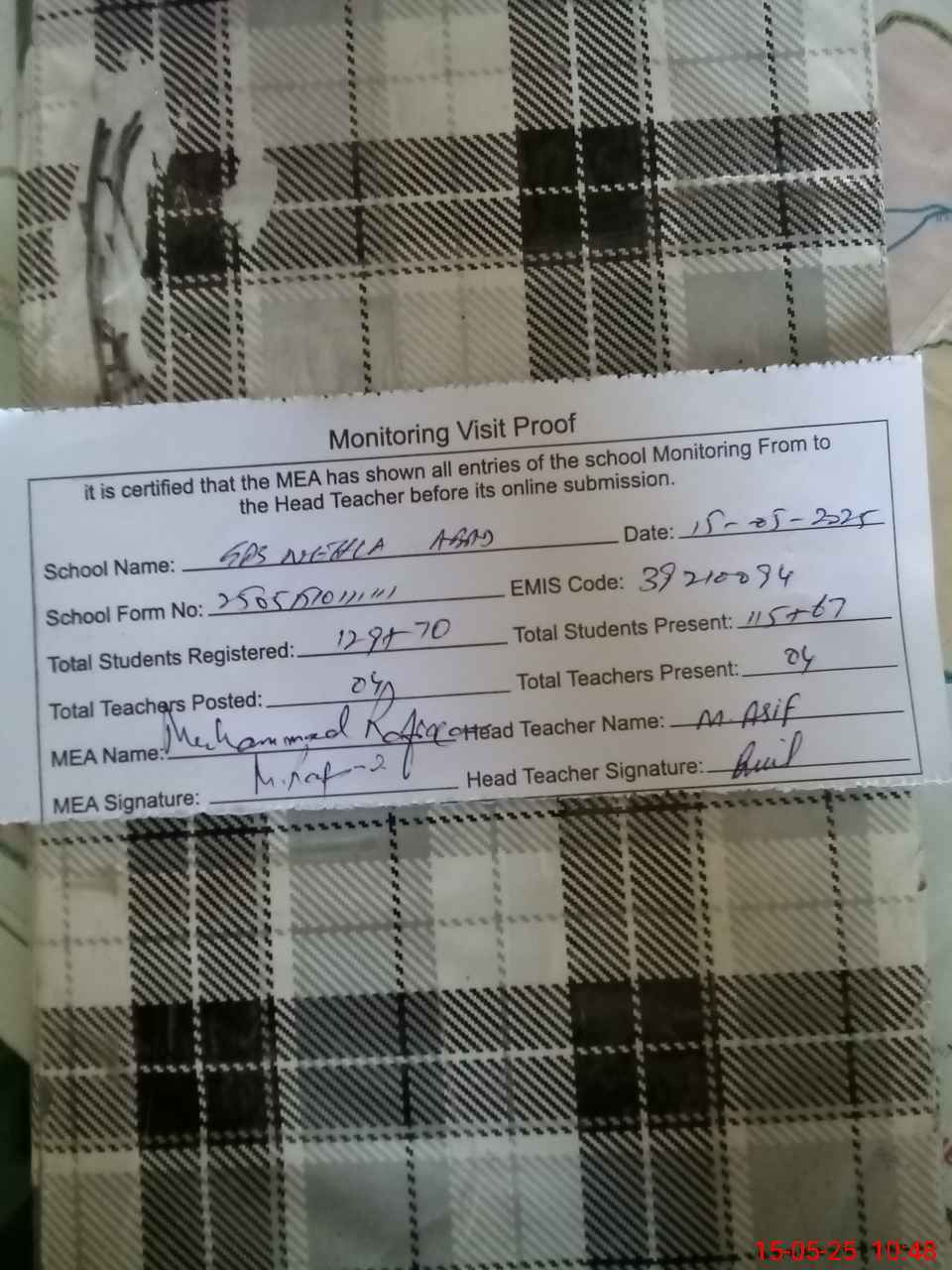 | Attendance Register | Head Teacher | MEA with School | Visit Proof |