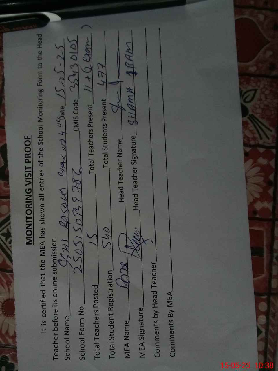 | Attendance Register | Head Teacher | MEA with School | Visit Proof |