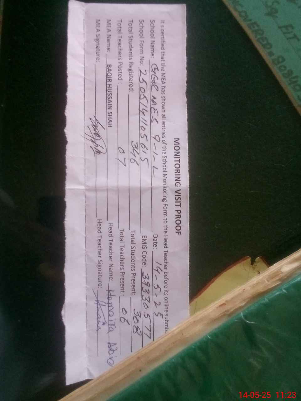 | Attendance Register | Head Teacher | MEA with School | Visit Proof |