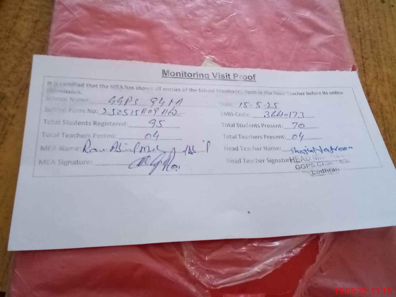 | Attendance Register | Head Teacher | MEA with School | Visit Proof |
