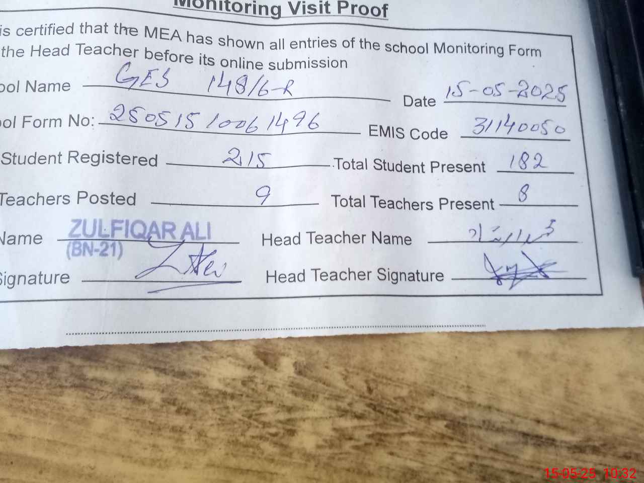 | EMIS Code: 31140050 | Name of School: GES CHAK NO. 148/6-R | |||