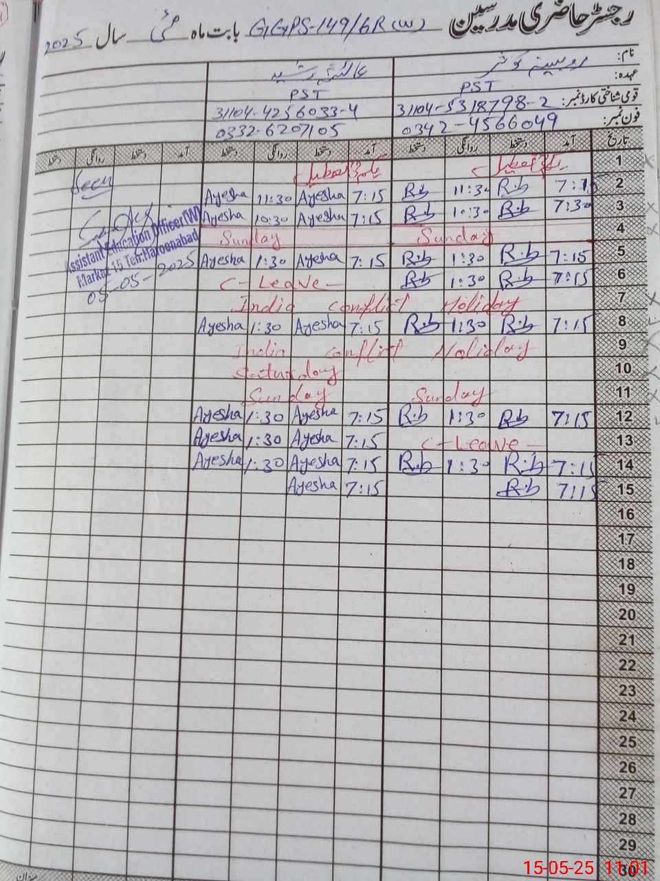 | Name: Ay**** Ra**** Designation: (School Headmaster's/Headmistress's) PST Phone/Cell Number: 03**** |
