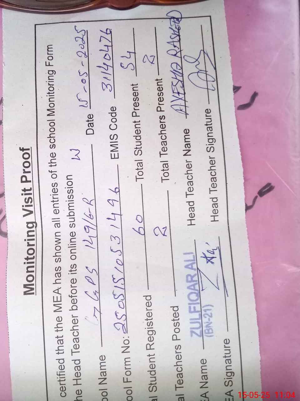 | Attendance Register | Head Teacher | MEA with School | Visit Proof |