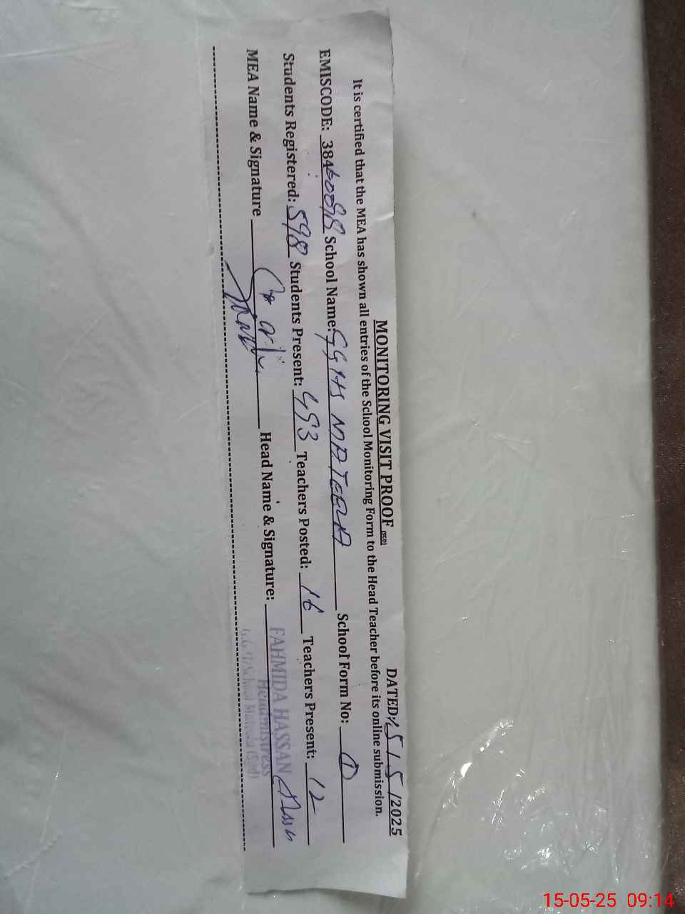 | Certified that this School was Inspected by the Undersigned MEA/DMO Today and the Information Stated Above is as Per Record. | |||||