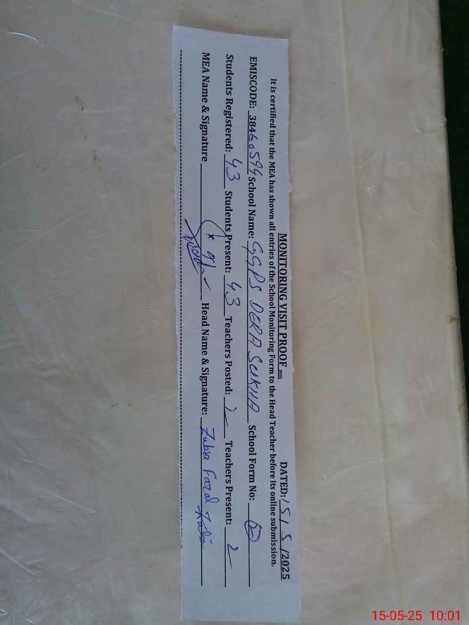 | Certified that this School was Inspected by the Undersigned MEA/DMO Today and the Information Stated Above is as Per Record. | |||||