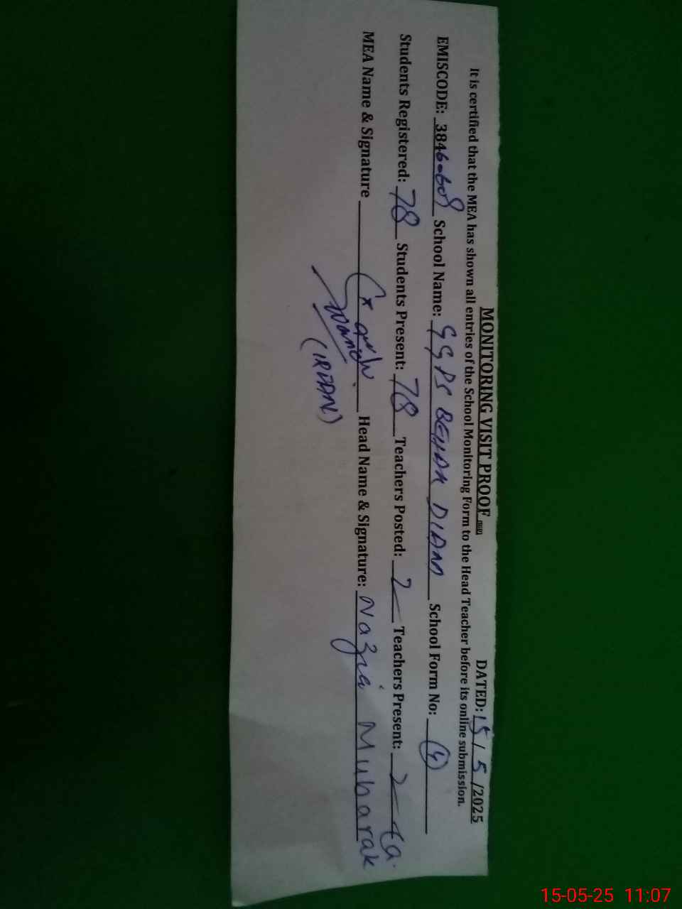 | Certified that this School was Inspected by the Undersigned MEA/DMO Today and the Information Stated Above is as Per Record. | |||||