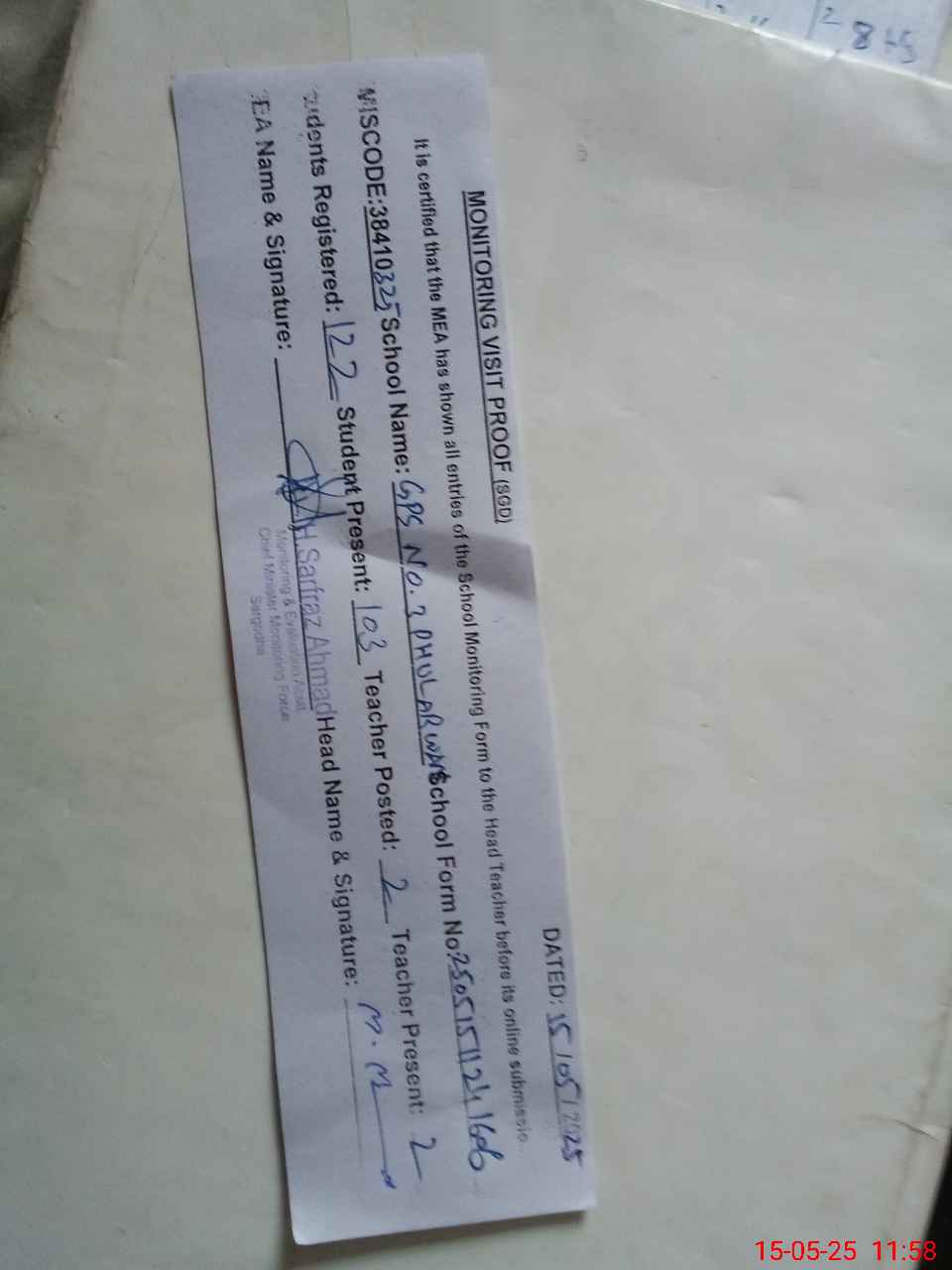 | Attendance Register | Head Teacher | MEA with School | Visit Proof |