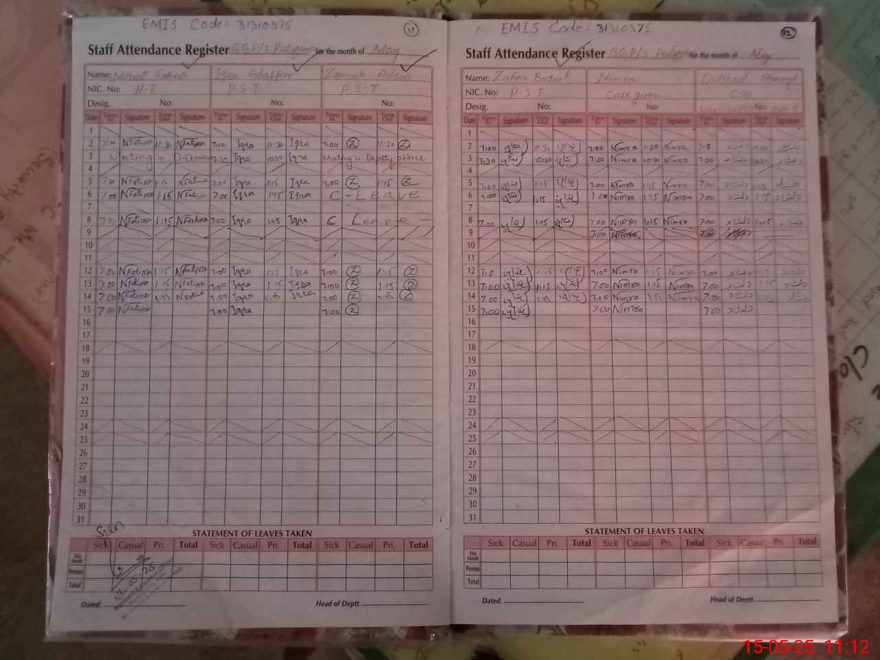 | CNIC | Full Name | Designation | R/C | Absence During Last Calender Month |
