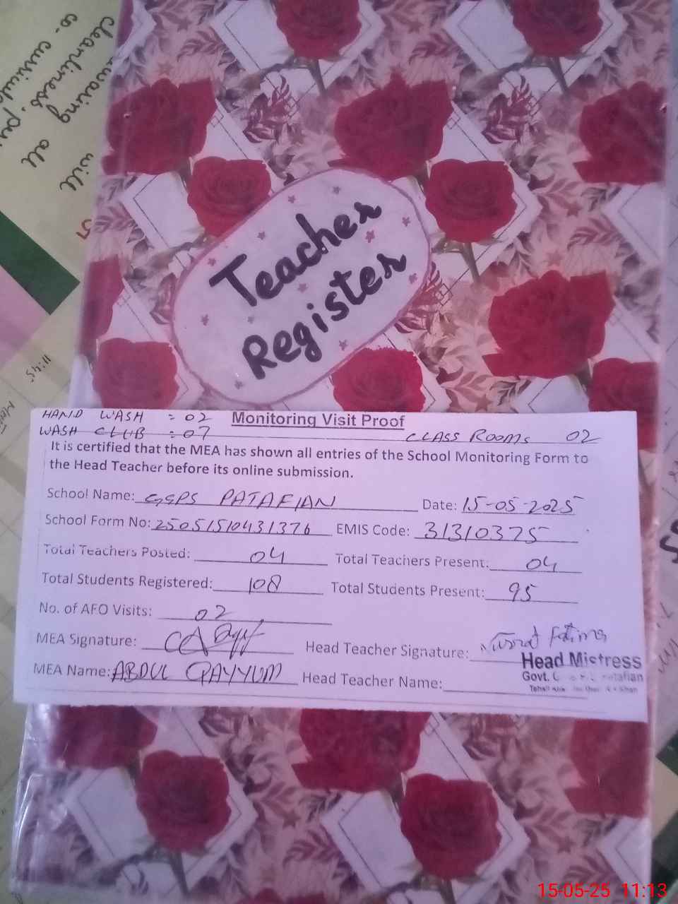 | Attendance Register | Head Teacher | MEA with School | Visit Proof |