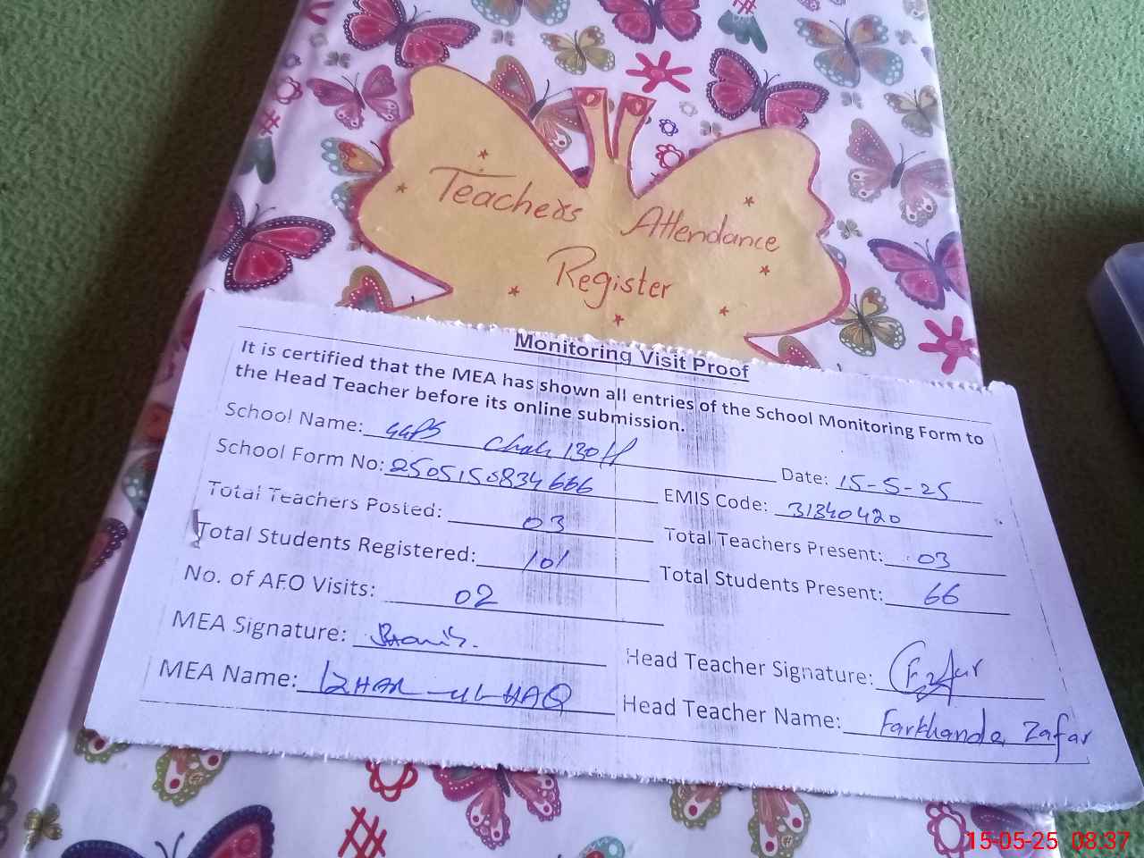 | Attendance Register | Head Teacher | MEA with School | Visit Proof |