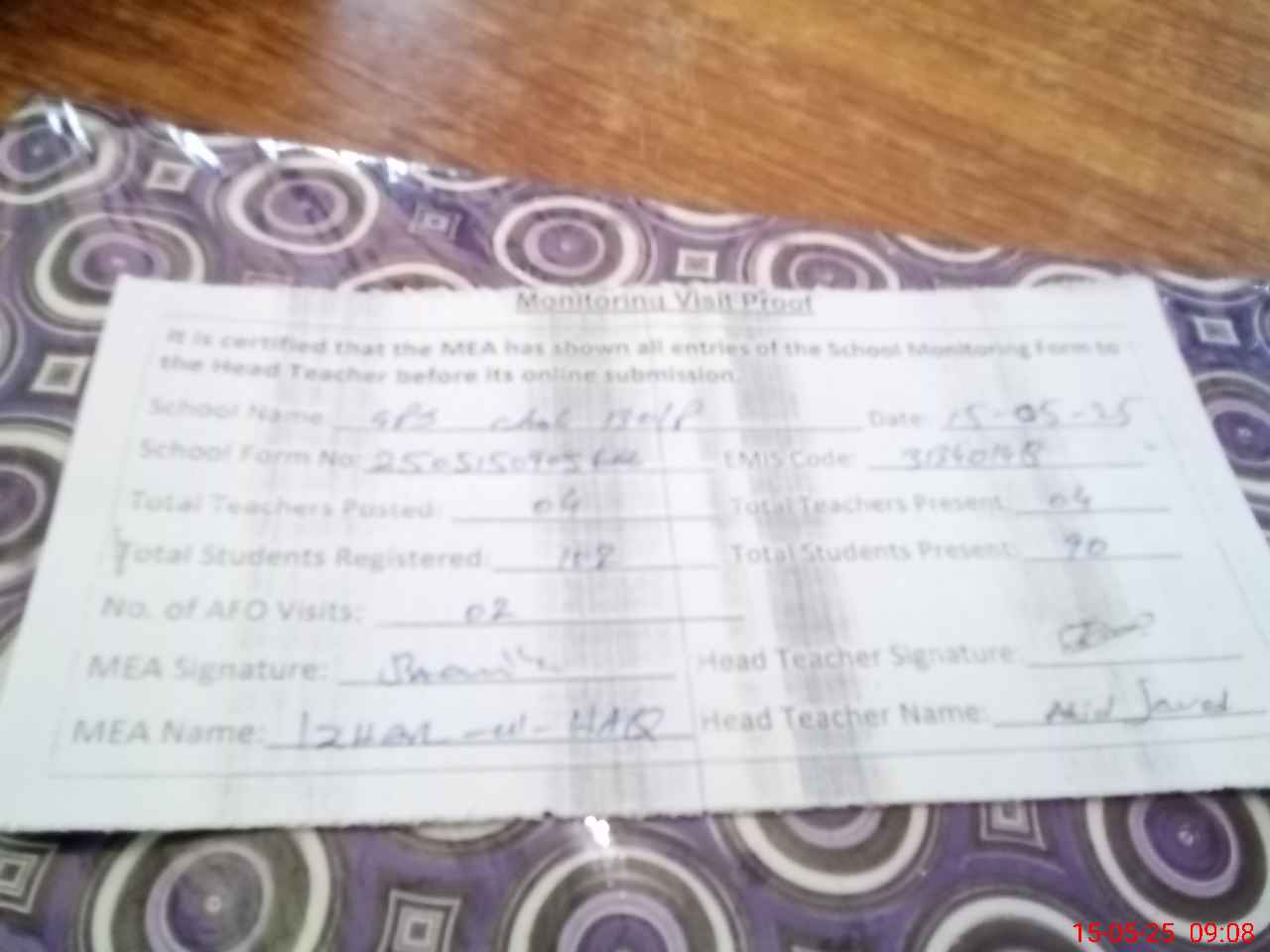 | Attendance Register | Head Teacher | MEA with School | Visit Proof |