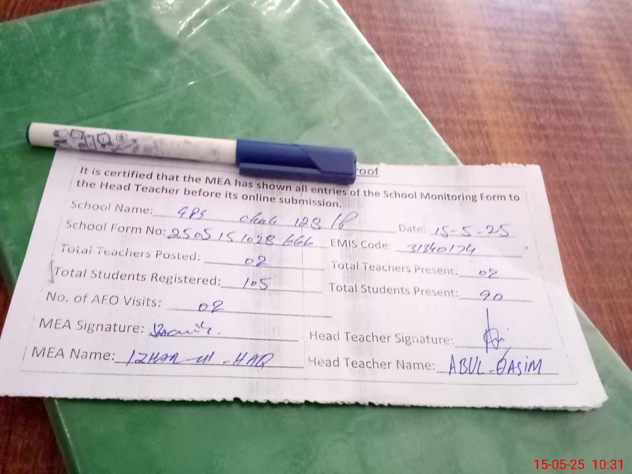 | Attendance Register | Head Teacher | MEA with School | Visit Proof |