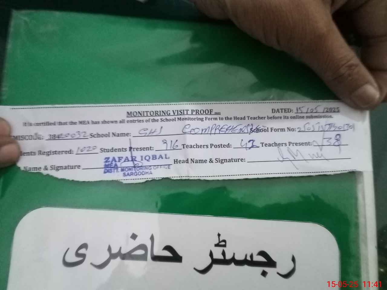 | Attendance Register | Head Teacher | MEA with School | Visit Proof |